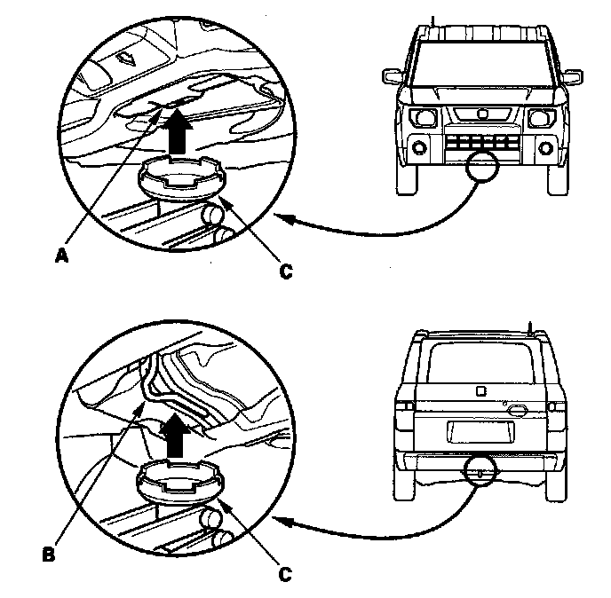 3. Position the floor jack under the front jacking bracket (A) or the rear jacking bracket (B). Center the jacking bracket on the jack lift platform (C), and jack up the vehicle high enough to fit the safety stands under it.