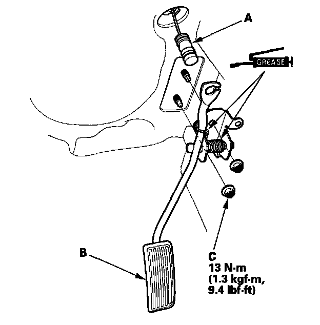 Remove the nuts (C) and the accelerator pedal.