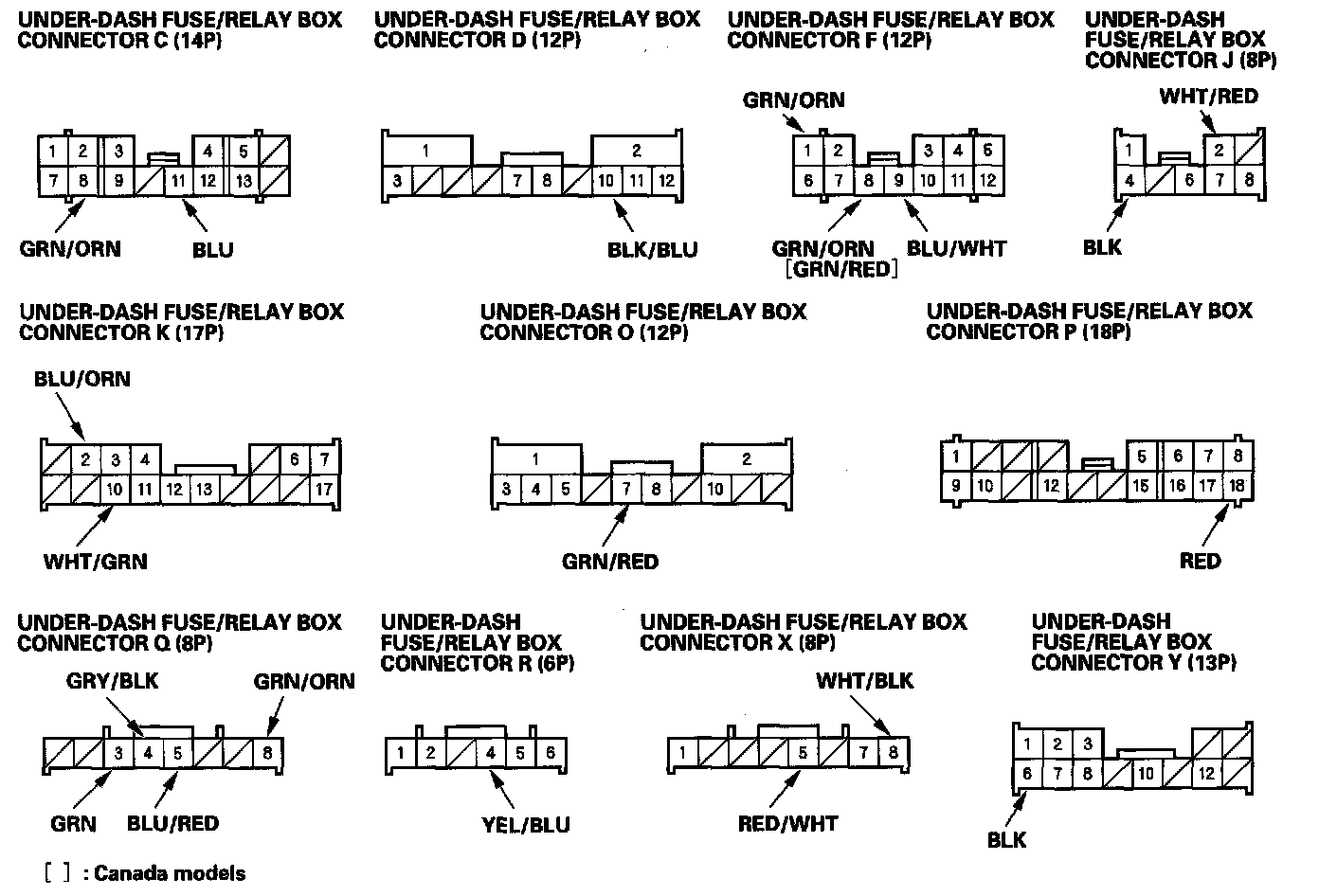 2. Disconnect the under-dash fuse/relay box connectors C, D, F, J, K, O, P, Q, R, X and Y.