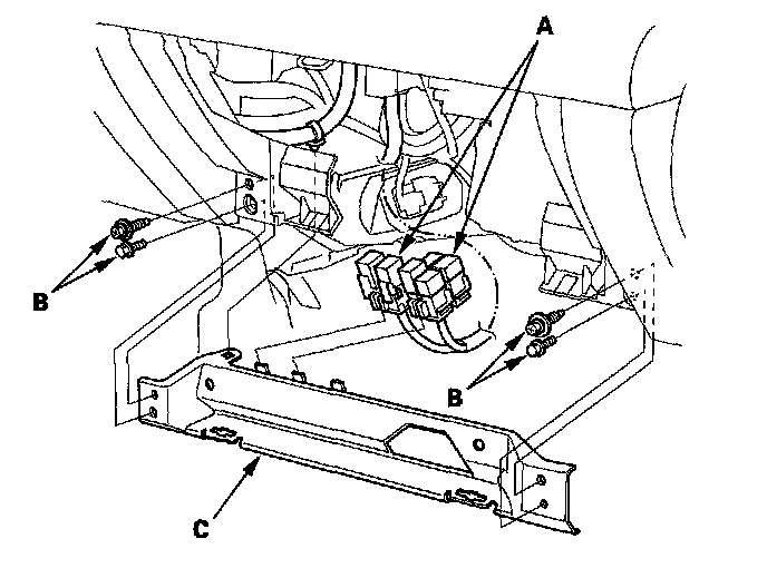 12. Remove the relays (A), then remove the bolts (B) and the glove box frame (C).