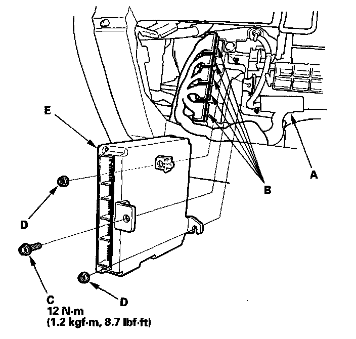 16. Remove the nuts (D), then remove the ECM/PCM (E).