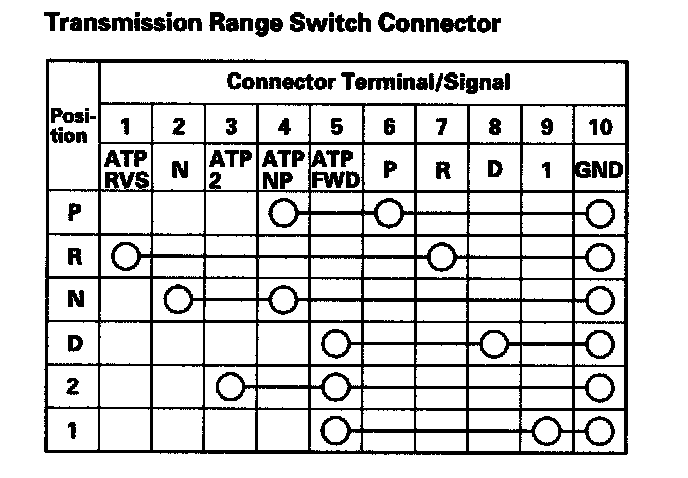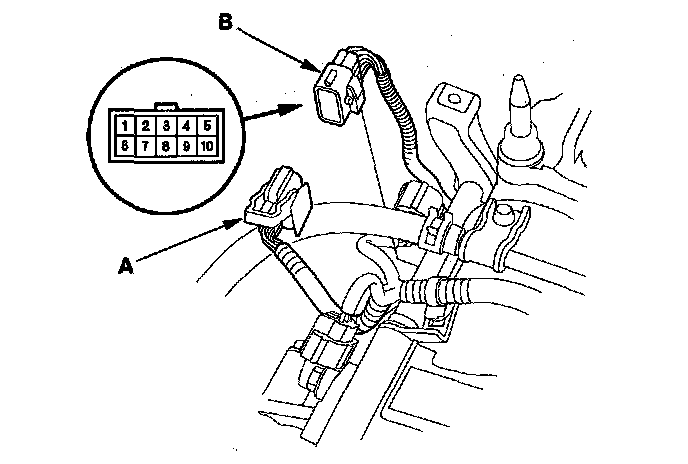 Transmission Range Switch Test1. Disconnect the transmission range switch harness connector (A), then remove the connector (B) from its bracket.