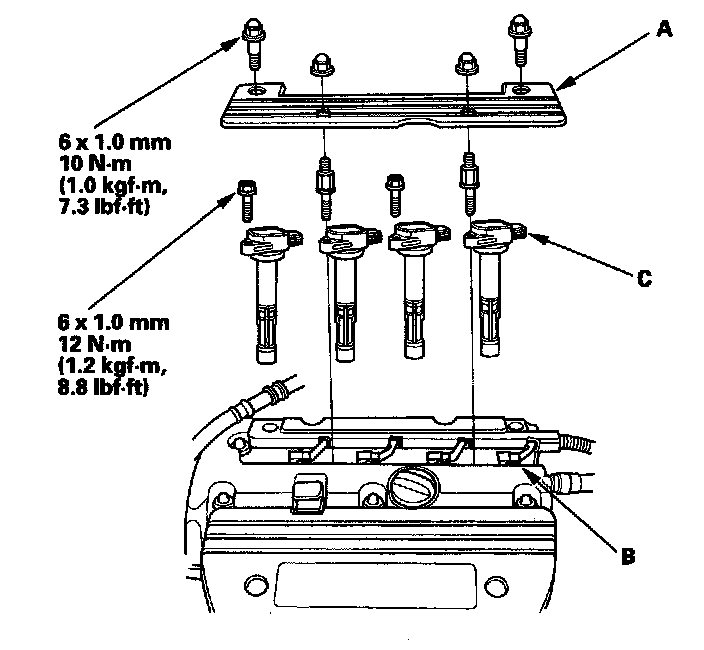 1. Remove the ignition coil cover (A), disconnect the ignition coil connectors (B), then remove the ignition coils (C).