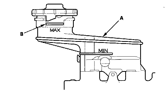 1. Make sure the brake fluid level in the reservoir (A) is at the MAX (upper) level line (B).
