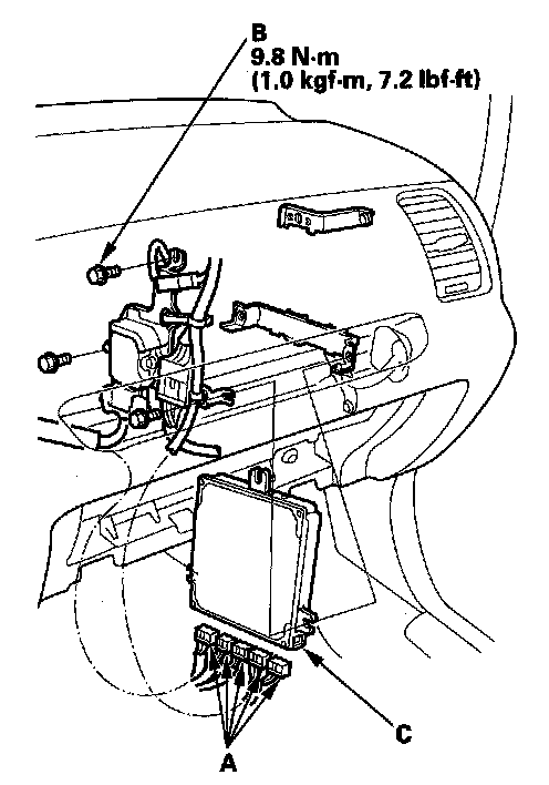 13. Disconnect the connectors (A), and remove the bolts (B) then remove the ECM/PCM (C).