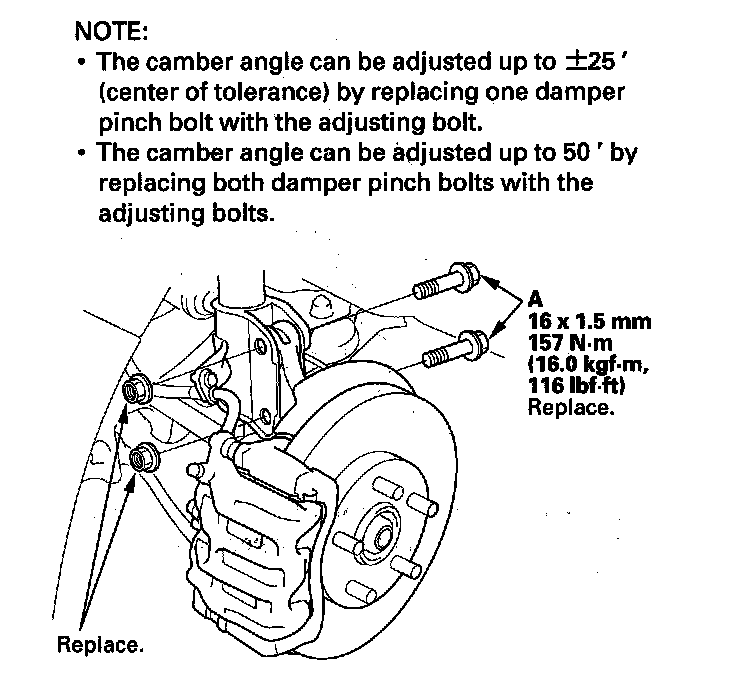 10. Replace the damper pinch bolts with the adjusting bolts (A), and adjust the camber angle.