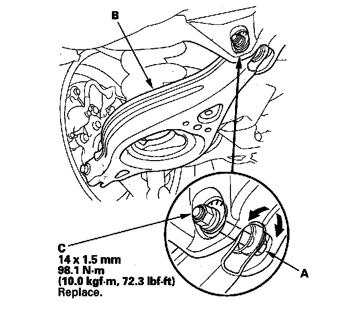 3. Hold the adjusting bolt (A) on the lower arm B, and remove the self-locking nut (C).