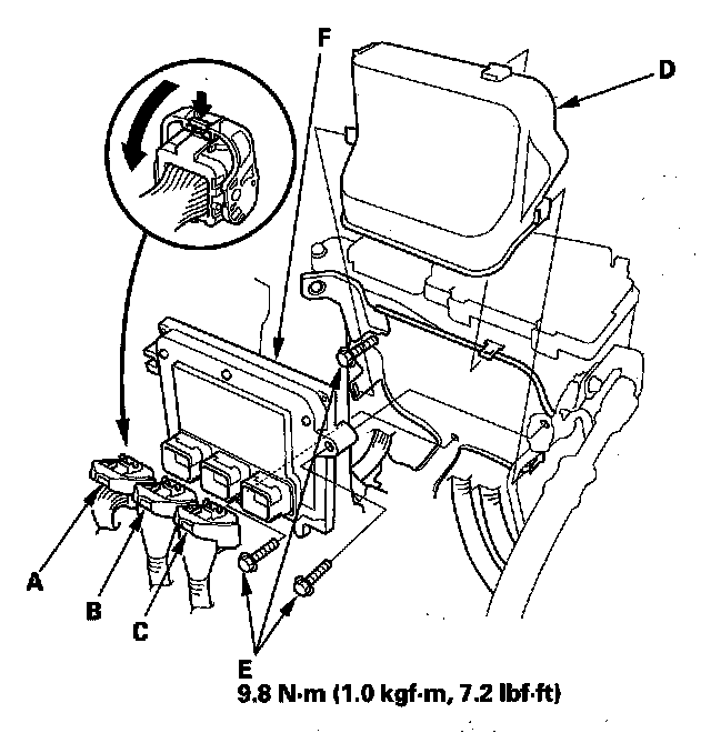 15. Loosen or remove the bolts (E), then remove the PCM (F).