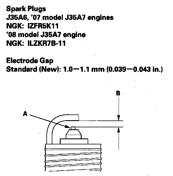3. Replace the plug at the specified interval or if the center electrode is rounded (A), or if the spark plug gap (B) is out of specification. Use only the spark plugs listed.