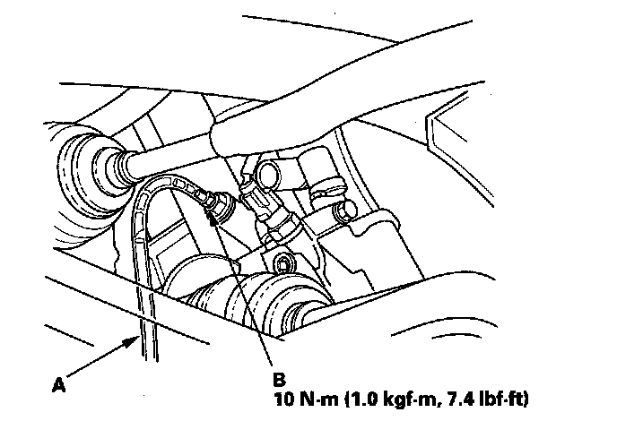 4. Install a rubber hose (A) on the drain bolt (B) located at the rear of the engine block, then loosen the drain bolt.