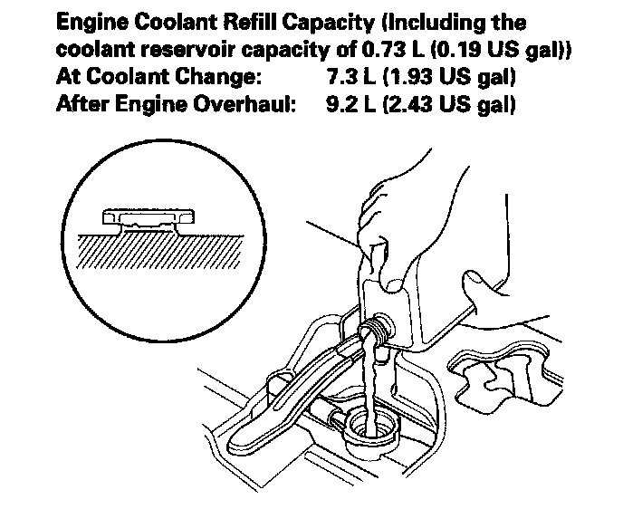 8. Pour Honda Long Life Antifreeze/Coolant Type 2 (P/N OL999-9001) into the radiator up to the base of the filler neck.