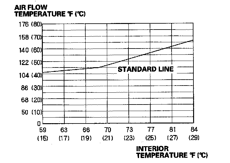 21. Set the climate control or heater control panel to maximum heat, and select high speed heat mode on the rear control panel. Measure the temperature of the air from the rear floor vent for 2 or 3 minutes. Make sure the temperature is above the standard line of the graph as shown. If the temperature is below the standard line, repeat steps 15 through 18 several more times. Then loosely install the radiator cap and recheck.