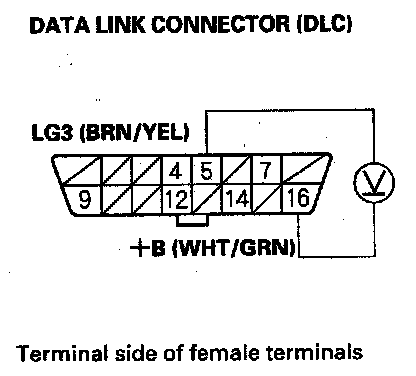 3. Measure voltage between DLC terminals No. 5 and No. 16.