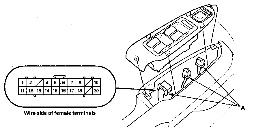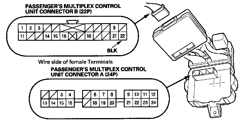 3. Make the following input tests at connector B (22P) and passenger's under-dash fuse/relay box socket connector A. Be careful not to spread the fuse box connectors.