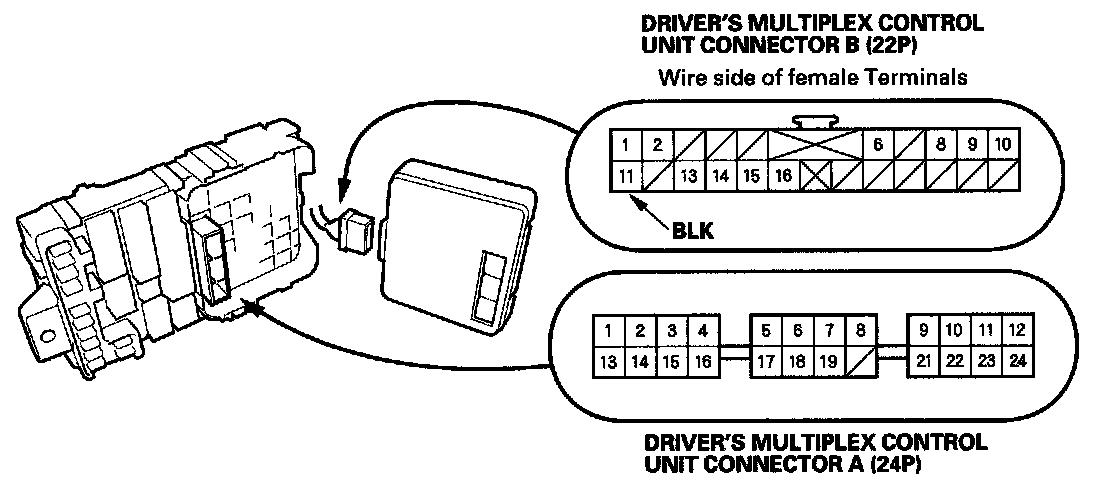 10. Make the following input tests at 22P connector B and the driver's under-dash fuse/relay box socket connector A. Be careful not to spread the fuse box connectors.