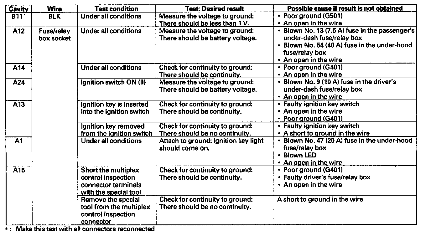 Multiplex Control Unit Input TestBefore performing the multiplex control unit input test, do the multiplex troubleshooting (Mode 1 and Mode 2).