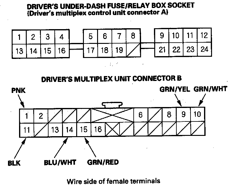 4. With the driver's multiplex control unit still disconnected, make these input tests at the connector and driver's under-dash fuse/relay box sockets.