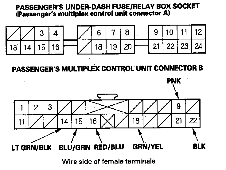 4. With the passenger's multiplex control unit still disconnected, make these input tests at the connector and passenger's under-dash fuse/relay box sockets.