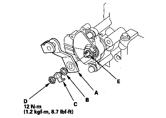 15. Install the new lock washer (A) over the selector control shaft (B) while aligning the projection (C) of the lock washer with the N positioning line (D) on the transmission range switch (E), and install the locknut (F).