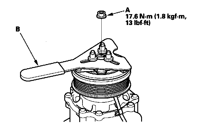 1. Remove the center nut (A) while holding the armature plate with a commercially available A/C clutch holder (B).