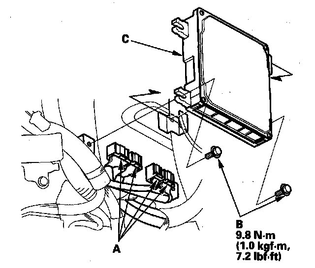 10. Remove the bolts (B), then remove the ECM (C).