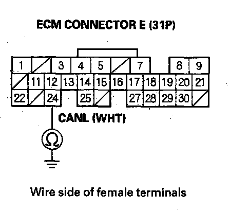 19. Check for continuity between ECM connector terminal E24 and body ground.