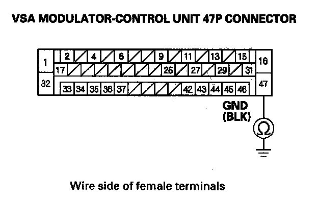 14. Check for continuity between VSA modulator-control unit 47P connector terminal No. 15 and body ground.