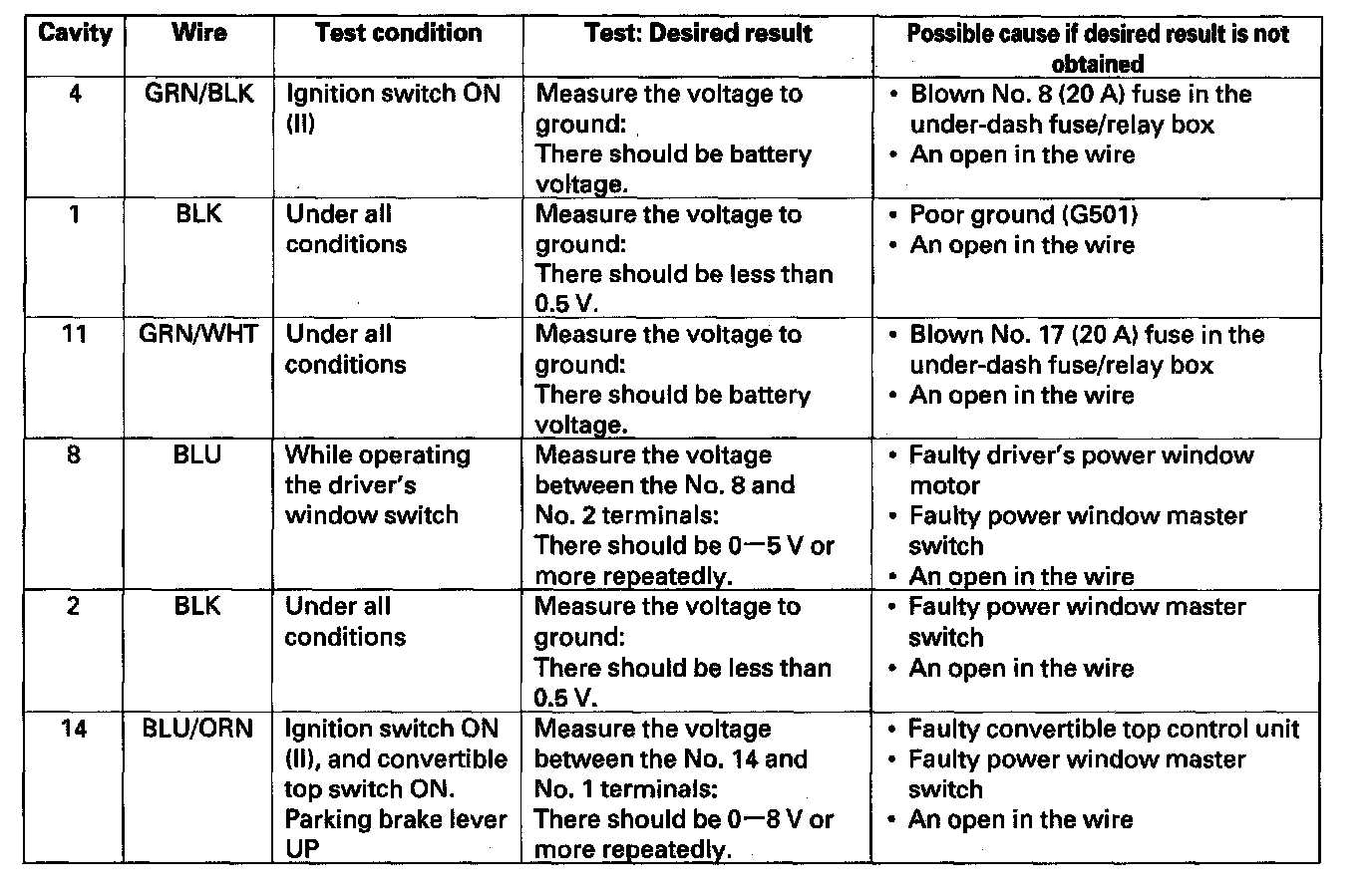 5. Reconnect the power window master switch, and perform the following input tests at the 14P connector.