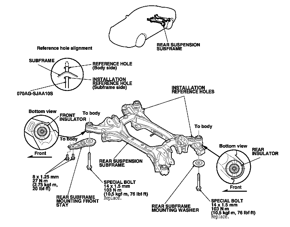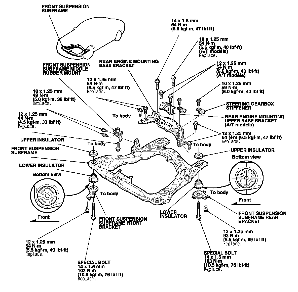 - After removing the subframe mounting bolts, be sure to replace them with new ones.