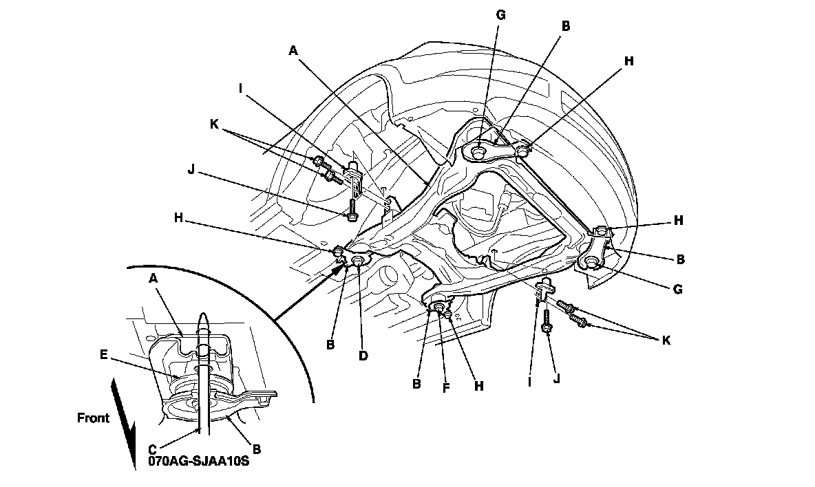 2. Set the front suspension subframe middle rubber mount (I) on both sides, and tighten the mounting bolts (J) that secure the rubber mounts to the body to the specified torque values. Tighten both subframe mounting bolts (K) securing the subframe and the rubber mounts to the specified torque values.