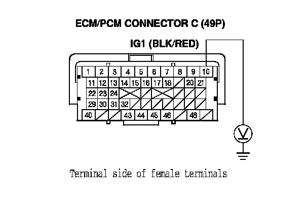 59. Measure the voltage between ECM/PCM connector terminal C10 and body ground.