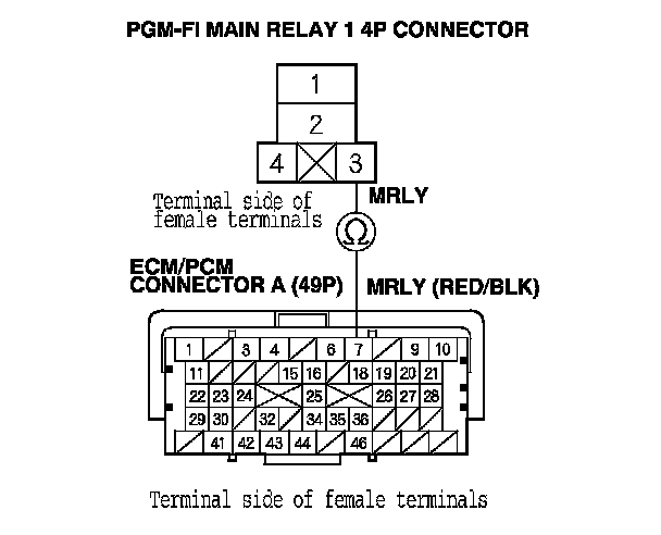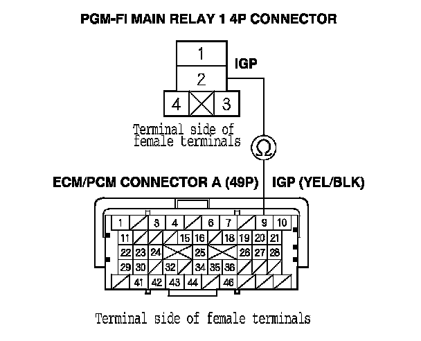 43. Check for continuity between PGM-FI main relay 1 4P connector terminal No. 2 and body ground.