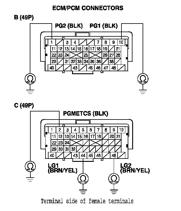 71. Check for continuity between body ground and ECM/PCM connector terminals B1, B10, C2, C44, and C48 individually.