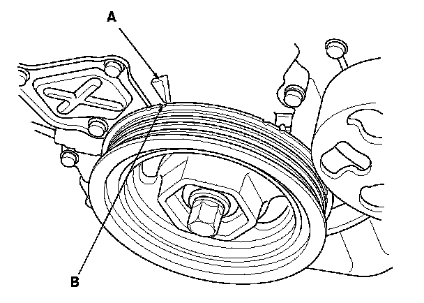 8. Aim the light toward the pointer (A) on the cam chain case. Check the ignition timing under a no load condition (headlights, blower fan, rear window defogger, and air conditioner are turned off).