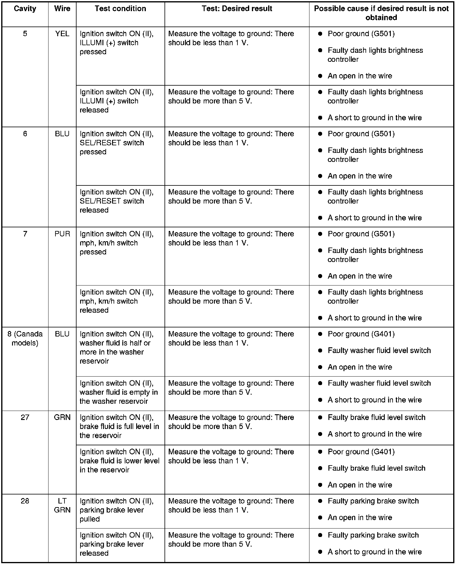 5. Reconnect the connector to the gauge control module (tach), and do these input tests at the following connector.