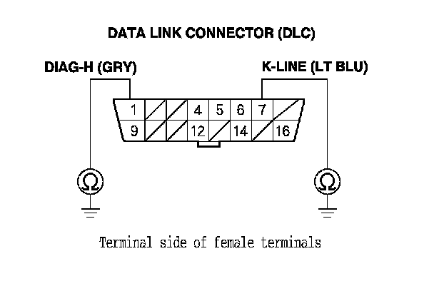 16. Check for continuity between body ground and DLC terminals No. 1 and No. 7 individually.
