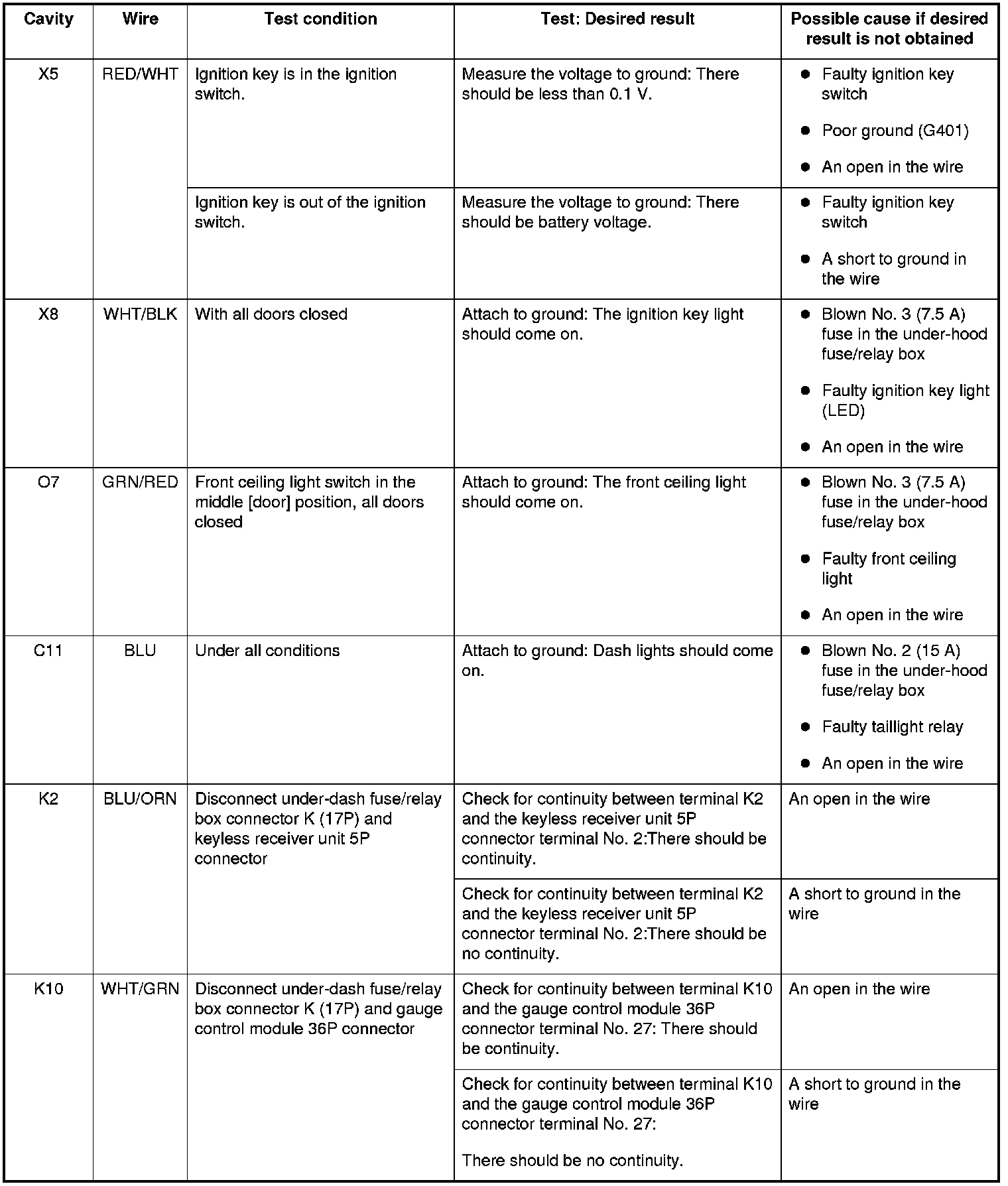 4. Reconnect the connectors to the under-dash fuse/relay box, and do these input tests at the following connectors on the under-dash fuse/relay box.