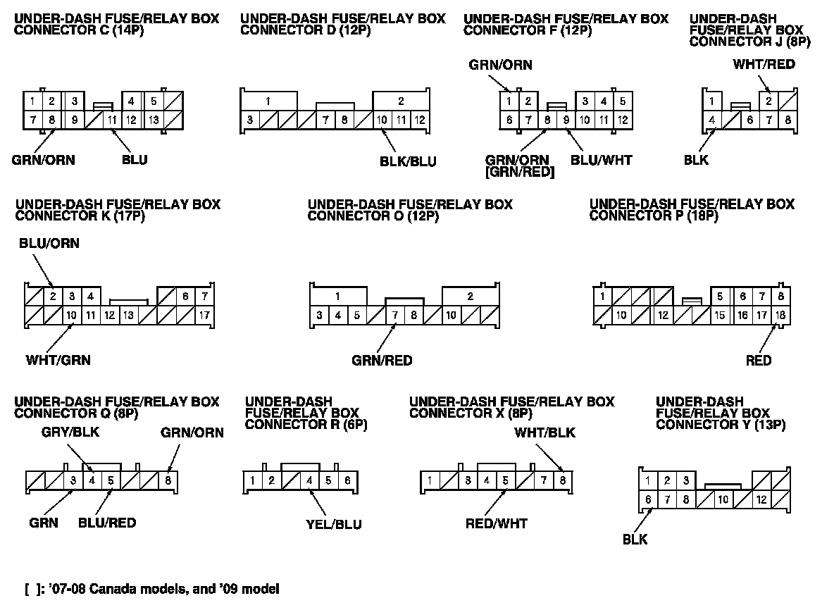 2. Disconnect under-dash fuse/relay box connectors C, D, F, J, K, O, P, Q, R, X and Y.