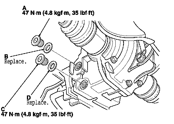 3. Remove the drain plug (C) and the sealing washer (D), and drain the fluid.