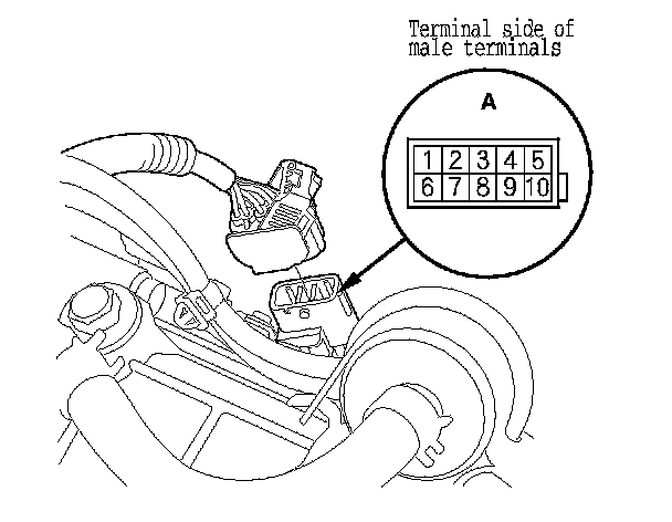 10. If there is no continuity between any terminals, remove the transmission range switch, and check the end of the selector control shaft (A).