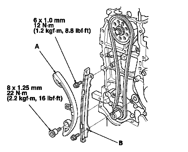 Install the cam chain tensioner (A) and the cam chain guide (B).
