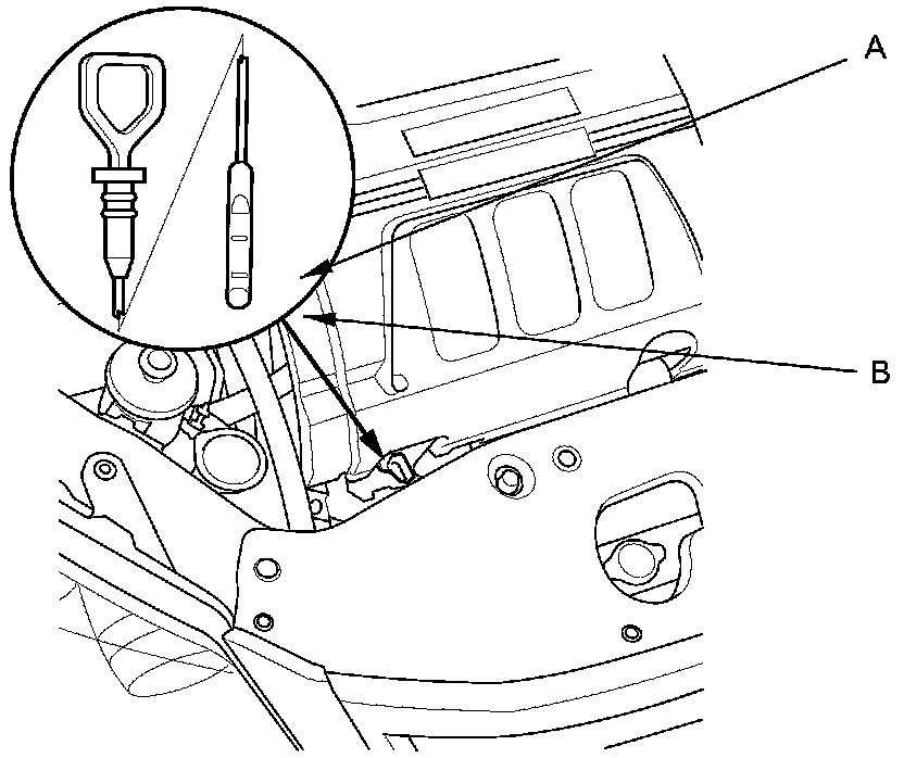 3. Remove the dipstick, and check the engine oil level. It should be between the upper mark (A) and the lower mark (B).