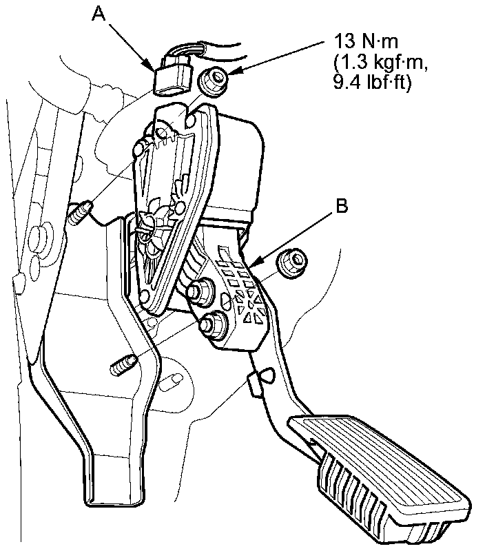 2. Remove the accelerator pedal module (B).