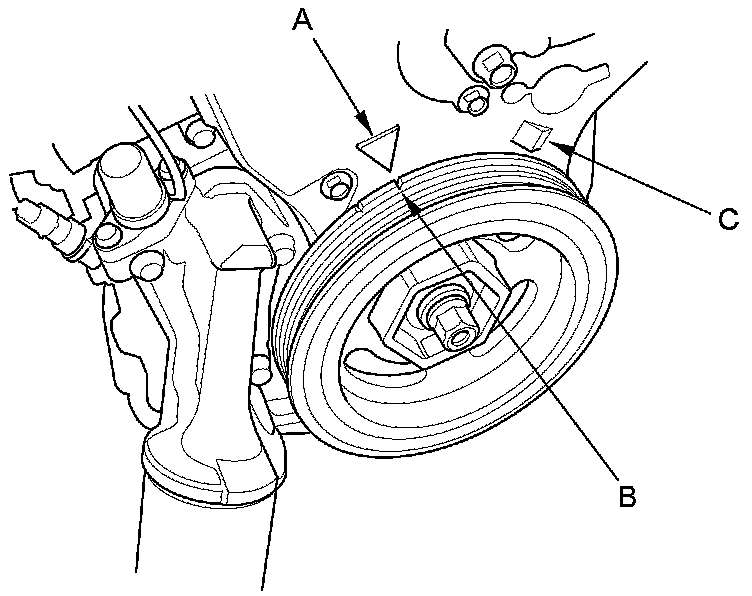 9. Aim the light toward the pointer (A) on the timing belt cover. Check the ignition timing under a no load condition (headlights, blower fan, rear window defogger, and air conditioner are turned off).