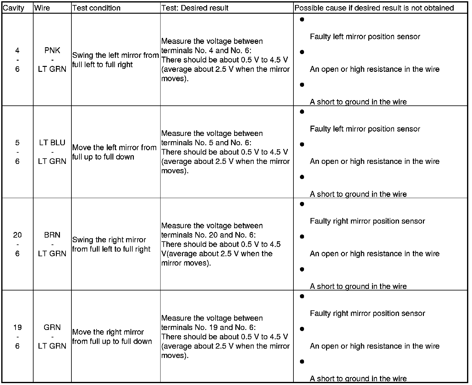 6. Reconnect the connector to the power mirror control unit, and do the following input tests.