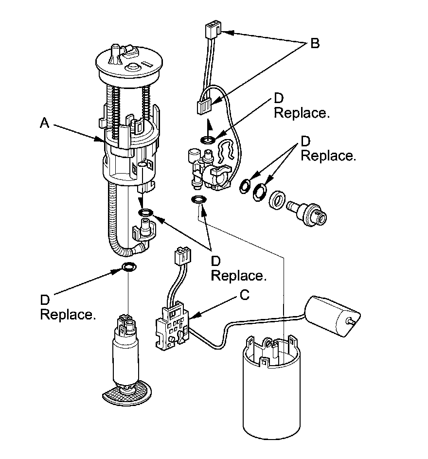 4. Install the parts in the reverse order of removal with new O-rings (D). When installing the fuel tank unit, align the marks on the unit and the fuel tank.