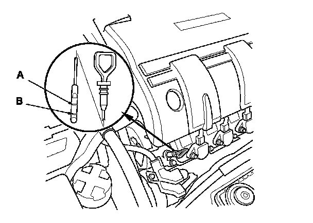 3. Remove the dipstick, and check the engine oil level. It should be between the upper mark (A) and lower mark (B).