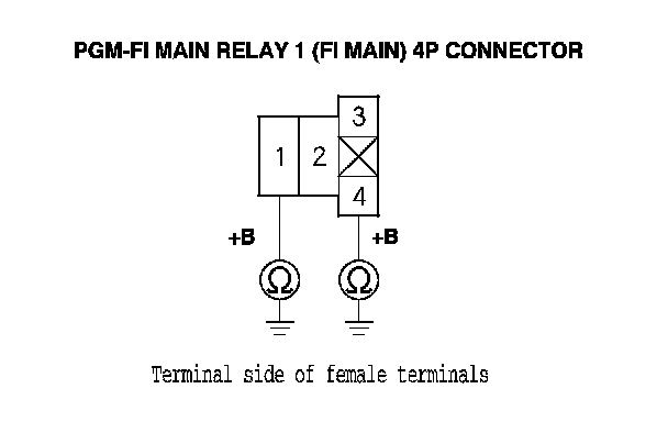 40. Check for continuity between body ground and PGM-FI main relay 1 (FI MAIN) 4P connector terminals No. 1 and No. 4 individually.