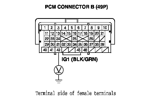 61. Measure the voltage between PCM connector terminal B42 and body ground.