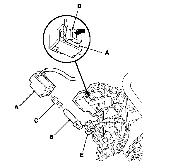 6. Remove the shift lock solenoid (A), the solenoid plunger (B), and the plunger spring (C) while prying up the solenoid lock (D).